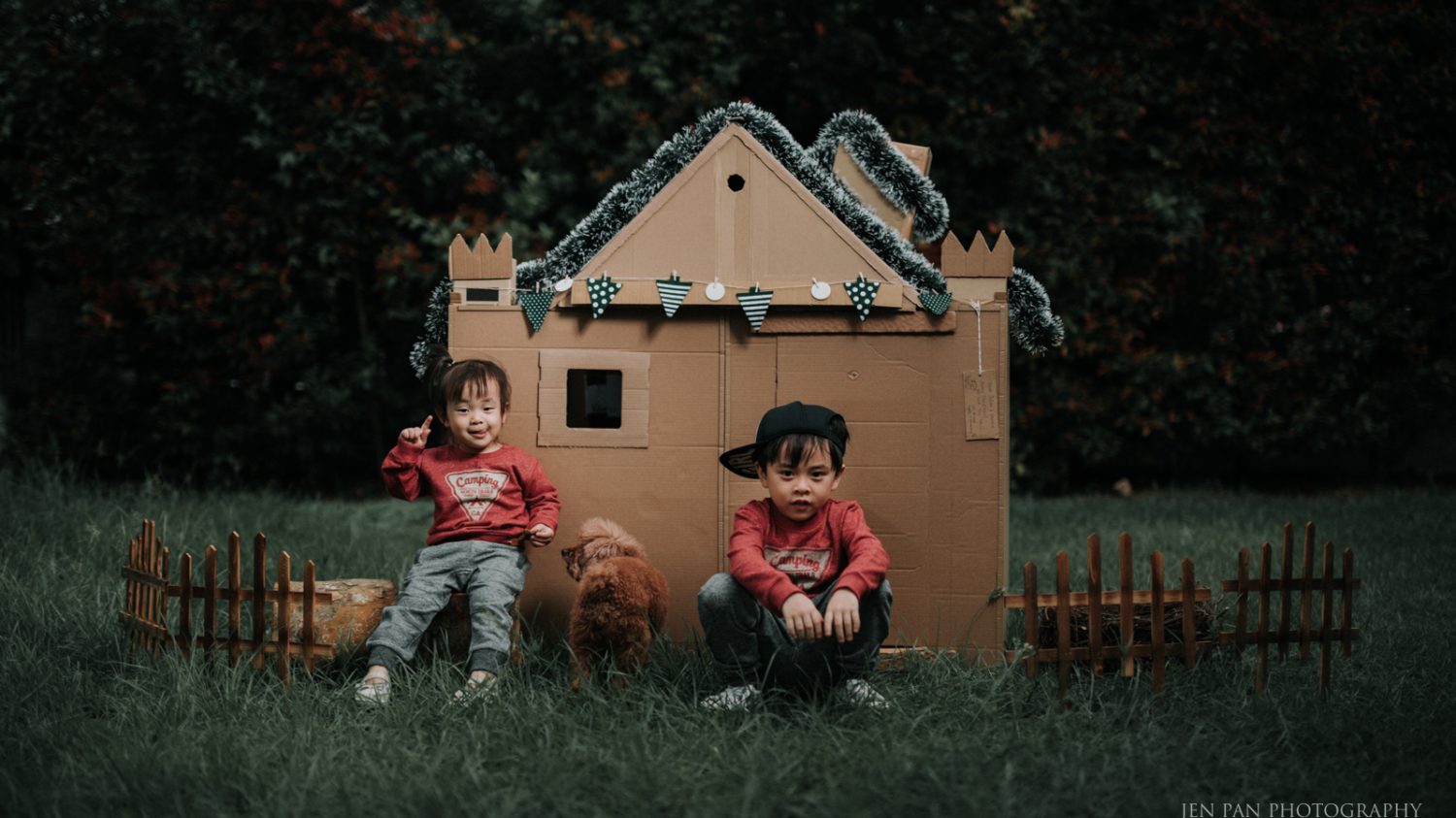 So for this year’s Christmas photoshoot how could we exclude our self made Xmas house! It is the first big toy they could play in harmony. Lots of laughter, much lesser fights. We brought the house out to  the garden on Sunday for a quick photoshoot (very tough as they just wanted to play) and then documented their play. It was so much fun seeing them running around , rolling in the wet grass (didn’t know it was wet at first, but whatever), throwing grass at each other and laughing so much! I couldn’t care less about muddy clothes and dirty shoes anymore when i see their elation. Just roll around like Peppa Pigs k. Hahha